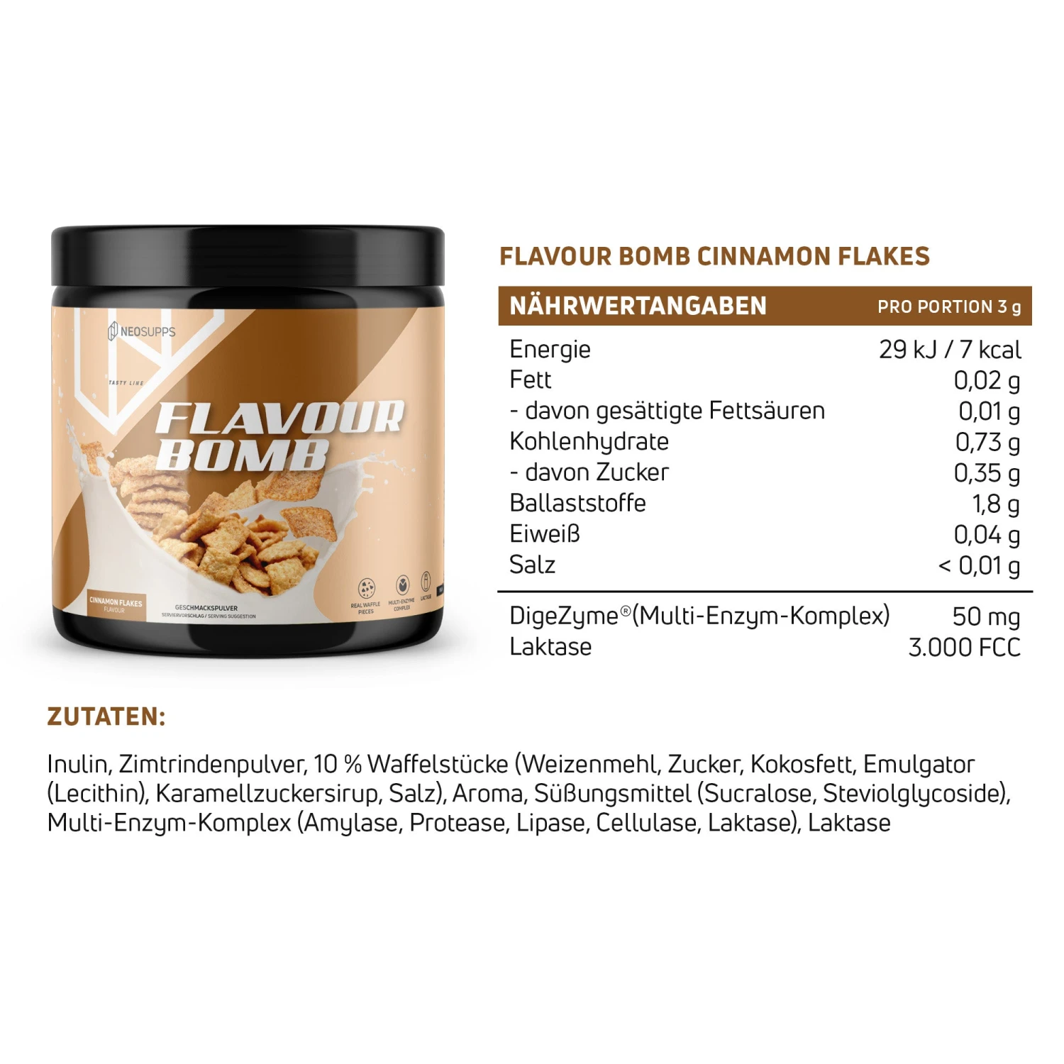 Mische nach Bedarf 1 Portion (3g) mit 300 ml Flüssigkeit. Die Neosupps Flavour Bomb können auch für Naturjoghurts, Quark- oder Haferspeisen verwendet werden.