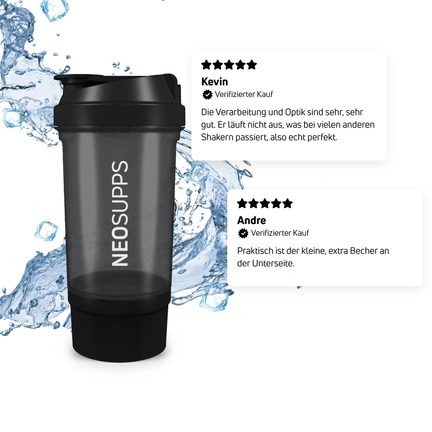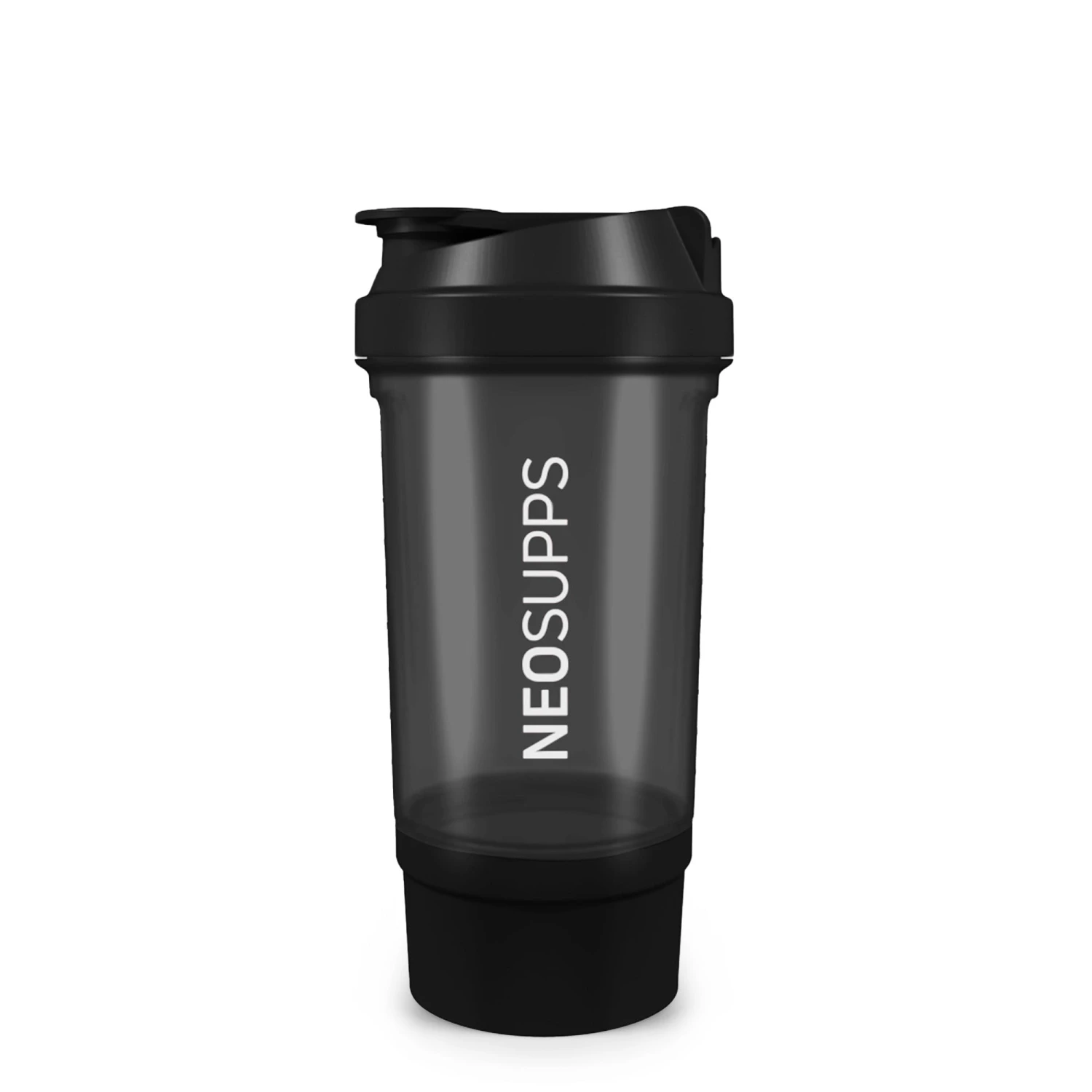 Der NEOSUPPS-Shaker ist optimal für unterwegs. Der feste Klappenverschluss hält den Shaker dicht. Kein lästiges Auslaufen mehr von Proteindrinks & Co. Darüber hinaus hat er ein extra getrennt und verschließbares Fach, um Kapseln oder Pulver in Portionsgröße mitzunehmen.