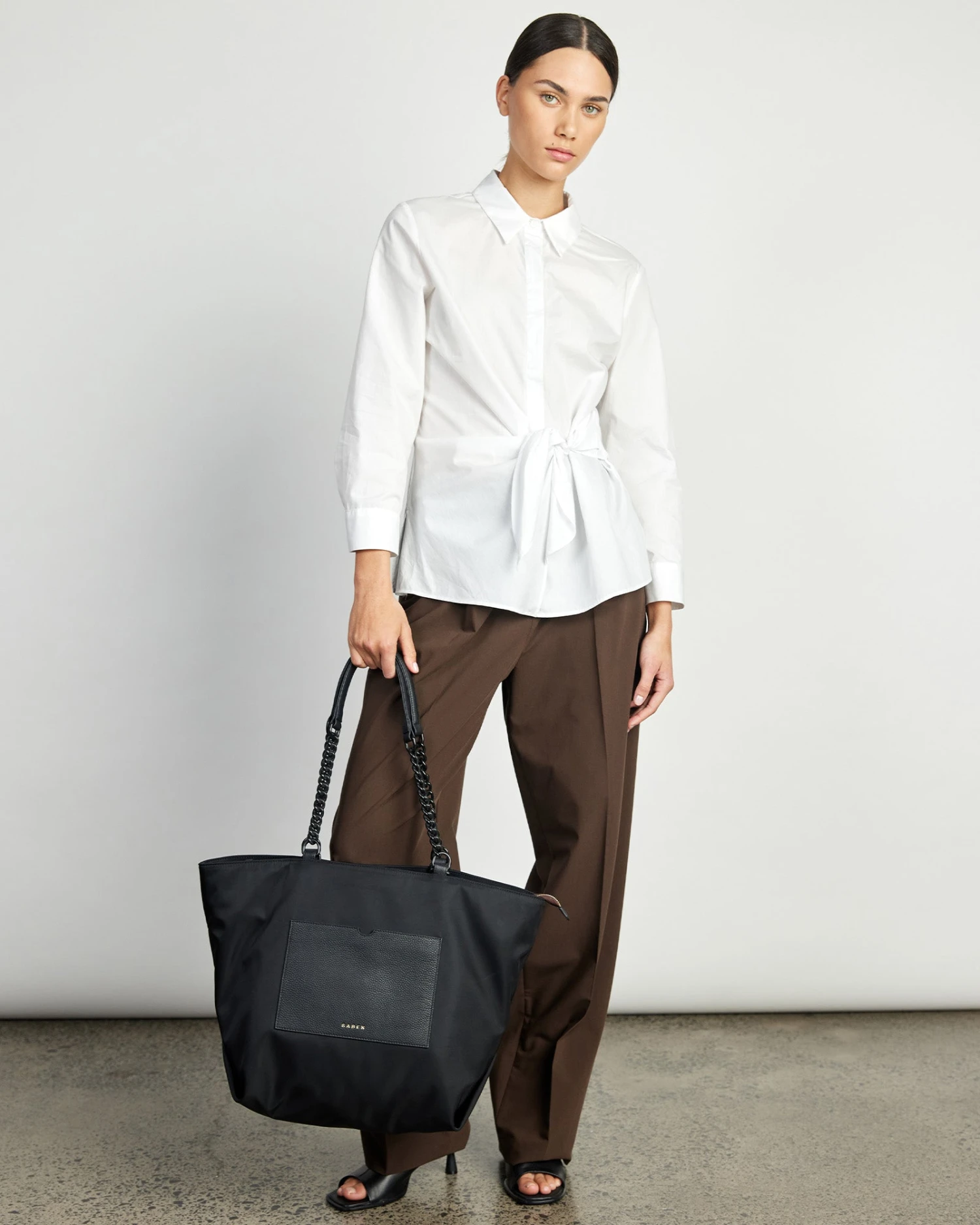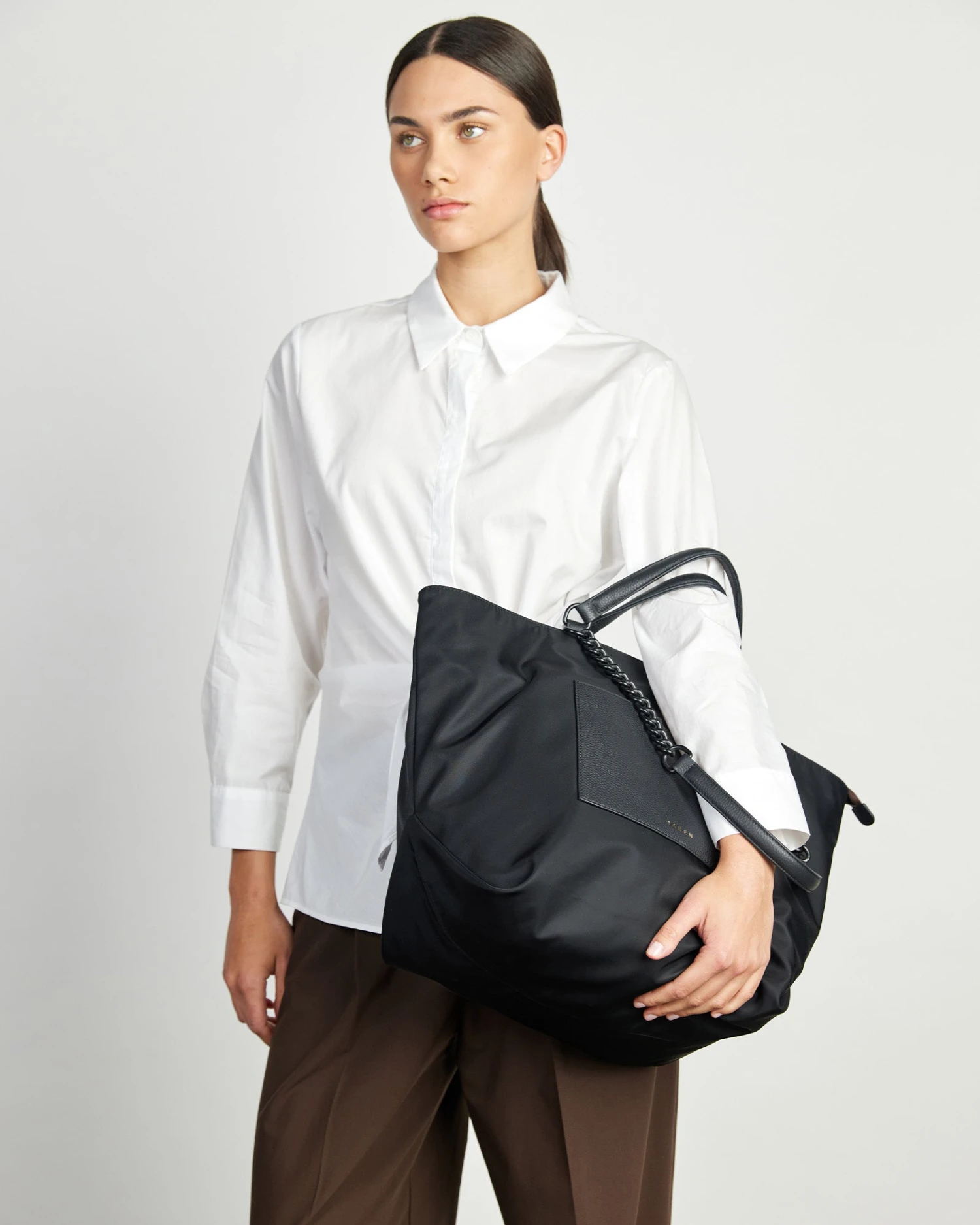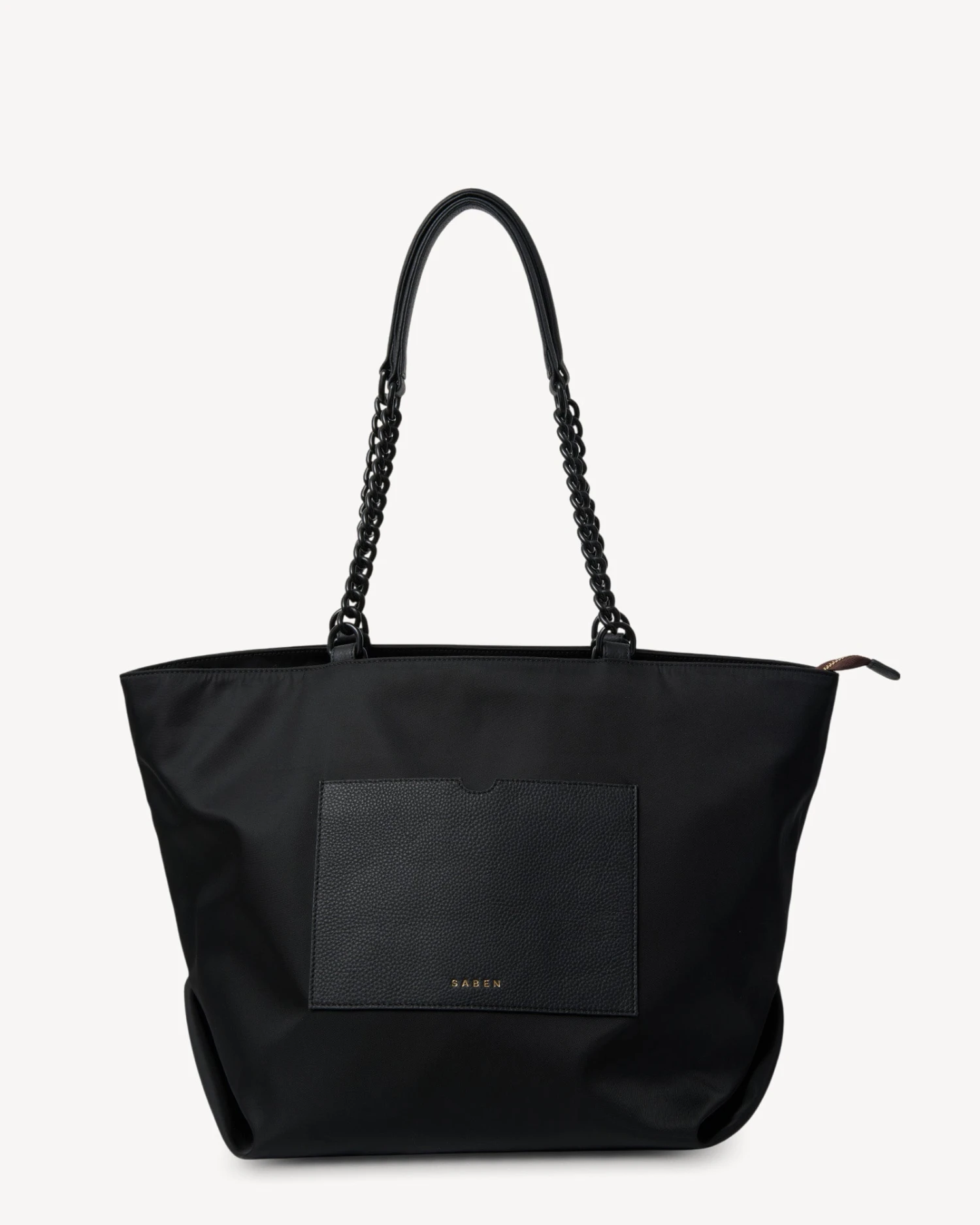 Introducing the Porto tote, made with innovative heavy duty recycled nylon that is both lightweight and timeless. Porto is the larger version of Saben favourite Paris Tote. Thoughtfully designed, Porto’s handles have been made to tuck inside the bag, so you can switch from shoulder bag to top handle tote at a moment’s notice. Feature chain strap handles with leather shoulder rests make for a comfortable commute.