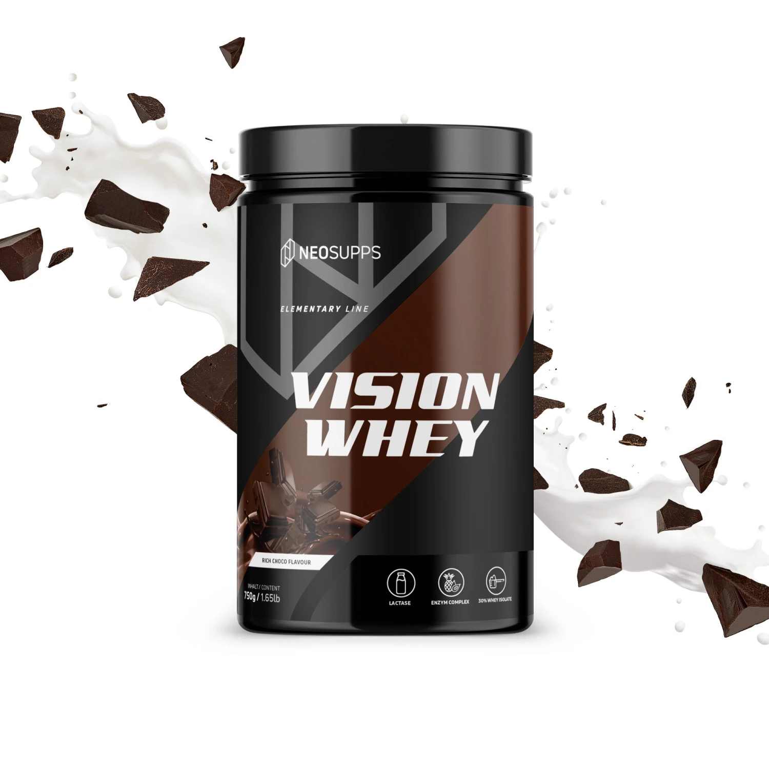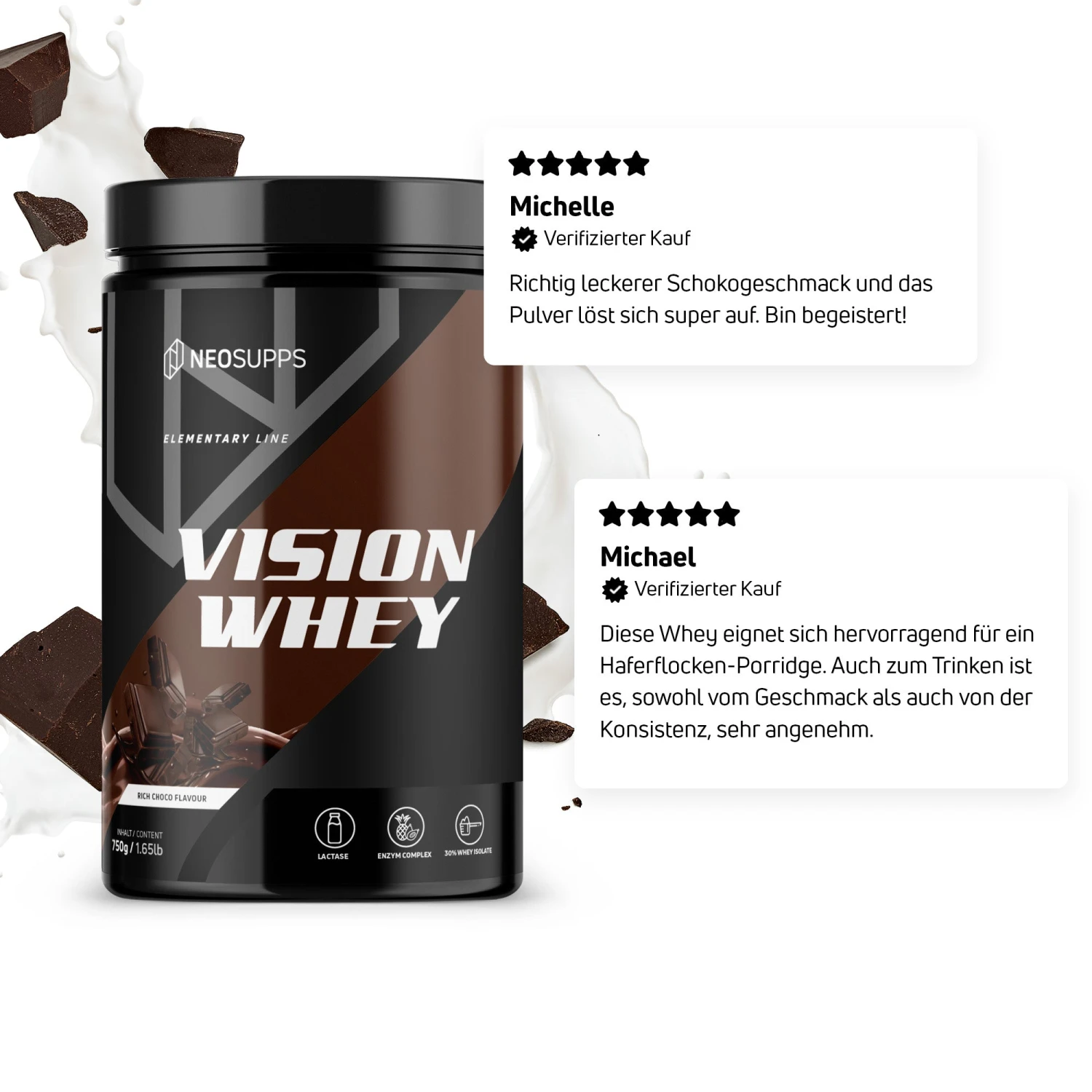 Das Vision Whey besteht aus einem hochwertigem Molkenproteinkonzentrat und 30% Molkenproteinisolat. Zusätzlich ist ein Verdauungskomplex aus Bromelain & Papain enthalten, die dafür sorgen, dass das Protein besser aufgespalten und vom Körper aufgenommen wird. Es überzeugt mit einer überragenden Löslichkeit und ist in sechs leckeren Geschmacksrichtungen erhältlich. Das Vision Whey erscheint im neuen Design, neue Dose und ist Made in Germany.